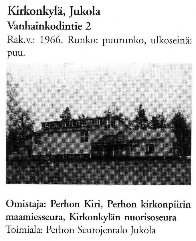 Kirkonkylän nuorisoseuran talo – kuvissa vanhempi rakennus, jonka paikkeille rakennettu myöhempi nykyrakennus, seurojentaloyhdistys Jukola 1960-luvulla. Historiasta tietää pahaiten Olavi Lassila olavi.lassila@gmail.com. Viime vuosina seurojentaloa on remontoitu avustusten ja toiminnan turvin. Talo soveltuu harrastus- ja pitopaikaksi, kokous- ja tanssipaikaksi.