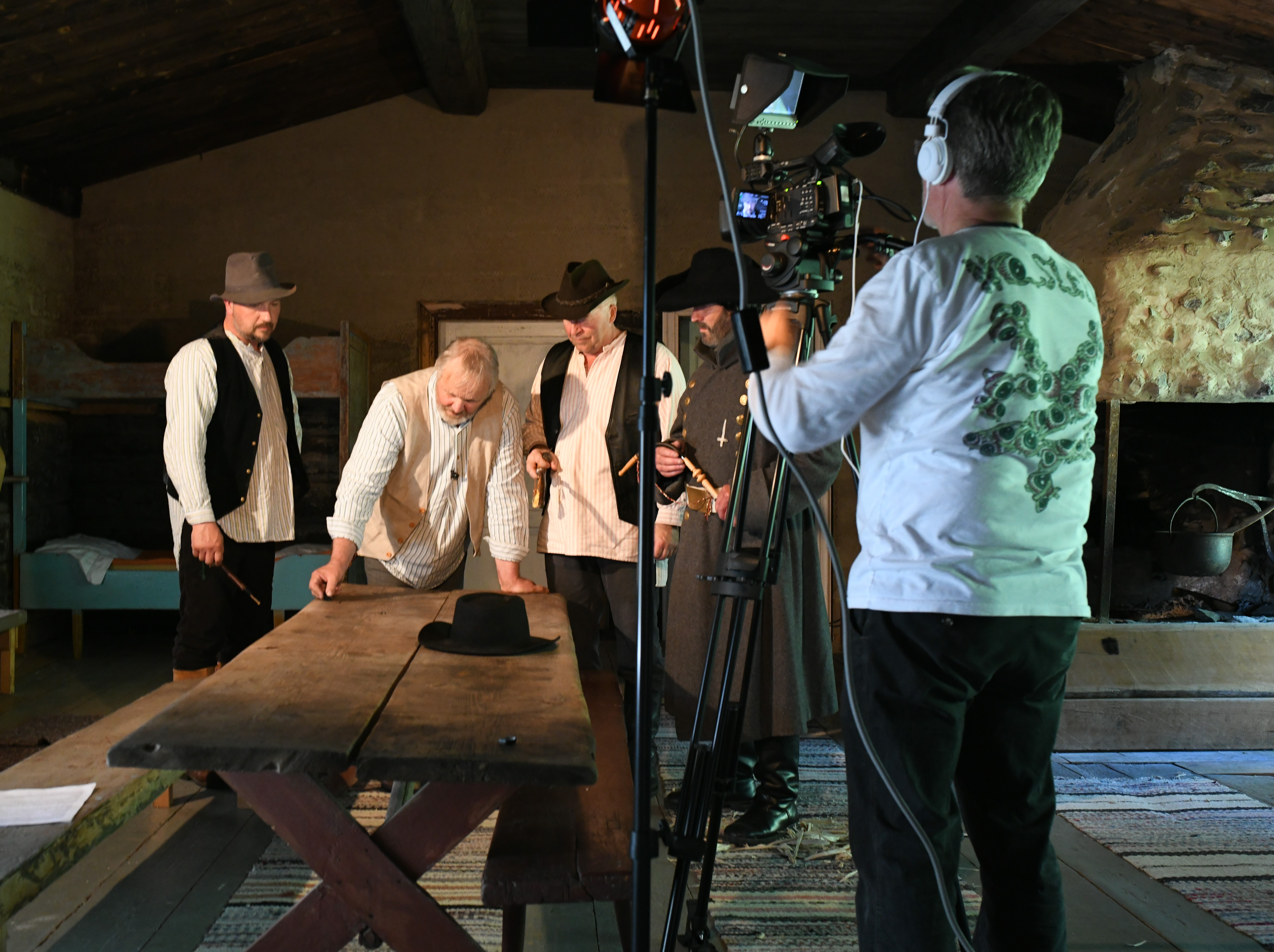 Lampuotissa on myös kuvattu Lauri Hietaniemen käsikirjoittama Perhon muonavaraston valtaus -näytelmä. Kuvauksissa vas. Pertti Hämäläinen, Olavi Lassila, Matias Kinnunen, Kari Viitala, kuvaaja Raimo Salo. Kuva Lauri Hietaniemi.